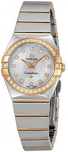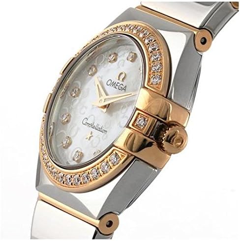 Stainless steel case and bracelet with 18kt rose gold bars. Fixed 18kt rose gold bezel set with diamonds. Mother of pearl dial with rose gold-tone hands and diamond hour markers. Dial Type: Analog. Luminescent hands. Quartz movement. Scratch resistant sapphire crystal. Push / pull crown. Solid case back. Case diameter: 24 mm. Round case shape. Deployment clasp with push button. Water resistant at 100 meters / 330 feet. Functions: hour, minute. Luxury watch style. Watch label: Swiss Made. Omega Constellation Diamond Mother of Pearl Dial Polished Steel Ladies Watch 12325246055005.