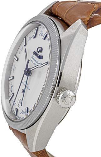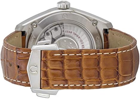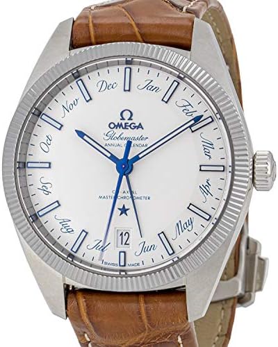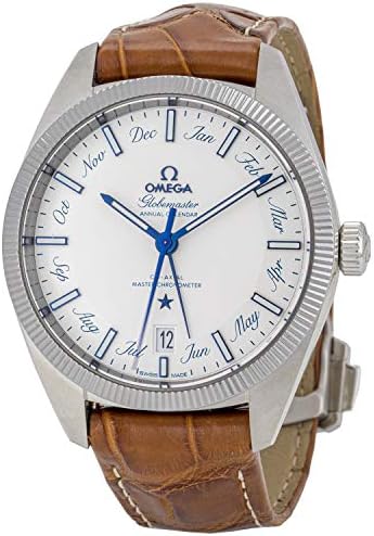 Stainless steel case with a brown (alligator) leather strap. Fixed stainless steel bezel. Silver dial with luminous blue hands and index hour markers. Months display. Minute markers around the outer rim. Dial Type: Analog. Luminescent hands and markers. Date display at the 6 o'clock position. Omega Calibre 8922 automatic movement with a 55-hour power reserve. Scratch resistant sapphire crystal. Pull / push crown. Transparent case back. Case size: 41 mm. Case thickness: 14.71 mm. Round case shape. Band width: 20 mm. Deployment clasp with a push button release. Water resistant at 100 meters / 330 feet. Functions: annual calendar, month, date, hour, minute, second, chronometer. Luxury watch style. Watch label: Swiss Made. Omega Globemaster Annual Calendar Automatic Mens Watch 130.33.41.22.02.001.