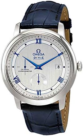 Grey dial enhanced by blue dauphine-style shape hands. Silver-tone stainless steel case with a blue alligator leather band. Automatic movement. 30 meters / 100 feet water resistance. Fixed bezel. Scratch Resistant Sapphire crystal. Solid caseback. Tang clasp. Pull / Push crown. Case size 39.5 mm. Band 20 mm x long. Omega 424.13.40.21.02.003 De Ville Watch.