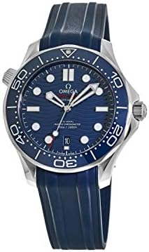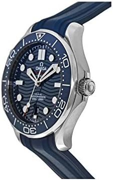OMEGA Seamaster self-winding automatic co-axial 210.32.42.20.03.001 men's watch. Round brushed with polished stainless steel case on a blue rubber strap. Blue ceramic dial with laser-engraved waves. White Superluminova filled luminescent index and dot hour markers. White Superluminova filled luminescent skeleton hands. Unidirectional rotating blue ceramic bezel. Date feature located at 6 o'clock. Helium escape valve located at the 10 o'clock position. Anti-magnetic feature. Powered by the Omega caliber 8800 self-winding automatic master chronometer movement which boasts a 55 hour power reserve. Total vibrations per hour: 25,200. Total jewels: 35. Domed scratch resistant sapphire crystal with anti-reflective treatment on both sides. Sapphire crystal exhibition case back. Screw down crown. Stainless steel tang buckle. Water-resistant to 300 meters / 1000 feet. Functions: hours, minutes, seconds, date, anti-magnetic movement, helium escape valve. Diving watch style. Swiss made.