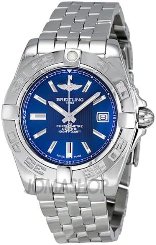 Stainless steel case with a stainless steel bracelet. Uni-directional rotating bezel. Blue dial with silver-tone hands and stick hour markers. Minute markers around the outer rim. Dial Type: Analog. Luminescent hands and markers. Date display appears at the 3 o'clock position. SuperQuartz movement with EOL indicator. Scratch resistant sapphire crystal. Screw down crown. Solid case back. Case diameter: 31.8 mm. Case thickness: 12.7 mm. Round case shape. Band width: 16 mm. Fold over clasp with safety. Water resistant at 100 meters / 330 feet. Functions: date, hour, minute, second. Luxury watch style. Watch label: Swiss Made. Breitling Galactic 30 Blue Dial Stainless Steel Ladies Watch A71356L2-C811SS.