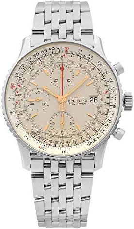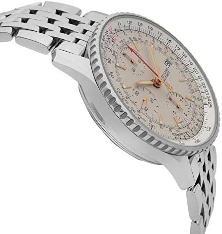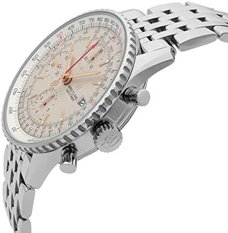 Silver dial enhanced by luminous rose gold-tone hands. Silver-tone stainless steel case with a silver-tone stainless steel band. Automatic movement. 30 meters / 100 feet water resistance. Bi-directional Rotating bezel. Scratch Resistant Sapphire crystal. Transparent caseback. Fold Over with Safety Release clasp. Pull / Push crown. Case size 41 mm x 14.44 mm. Band 22 mm x 7 incheslong. Breitling A13324121G1A1 Navitimer 1 Watch.