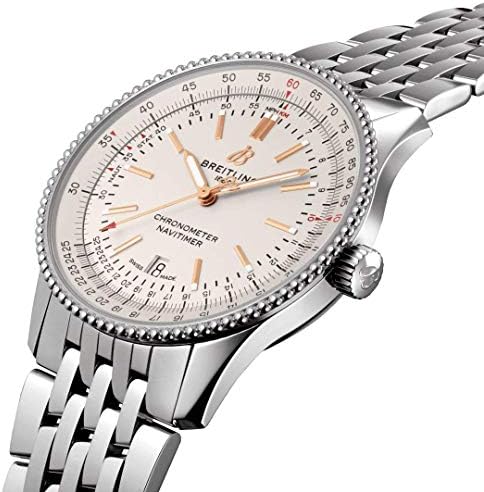 Silver dial enhanced by luminous rose gold-tone hands. Silver-tone stainless steel case with a silver-tone stainless steel band. Automatic movement. 30 meters / 100 feet water resistance. Uni-directional Rotating bezel. Scratch Resistant Sapphire crystal. Solid caseback. Deployment with Push Button Release clasp. Pull / Push crown. Case size 41 mm x 10.1 mm. Band 22 mm x long. Breitling A17326211G1A1 Navitimer 1 Watch.