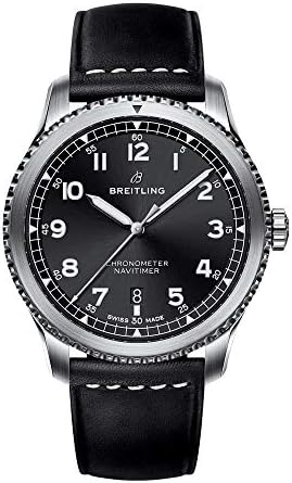 Black dial enhanced by luminous silver-tone hands. Silver-tone stainless steel case with a black leather band. Automatic movement. 100 meters / 330 feet water resistance. Bi-directional Rotating bezel. Scratch Resistant Sapphire crystal. Solid caseback. Tang clasp. Screw Locked crown. Case size 41 mm x 10.74 mm. Band 21 mm x long. Breitling A17314101B1X1 Navitimer 8 Watch.