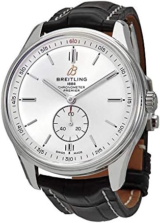Breitling Premier Automatic 40 A37340351G1P1 men's watch. Features a polished stainless steel case and black leather strap with crocodile pattern. Polished stainless steel fixed bezel. Silver dial with luminescent hour and minute hands. Small seconds sub-dial at 6 o'clock. Powered by the Breitling Caliber 37 self-winding automatic COSC Chronometer certified movement which boasts a 38 hour power reserve and beats at 28,800 vph. A cambered, scratch resistant sapphire crystal glareproofed on both sides protects the dial. The case is round, 40mm in diameter and 11.40mm thick. Inlet size: 20mm. Non screw-locked crown with 2 gaskets. Screw down case back. Stainless steel deployment buckle. Water resistant to 100 meters / 330 feet. Functions: hours, minutes, small seconds. Dress watch style. Swiss made.