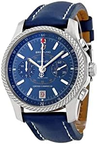 Stainless steel case with a blue leather strap. Platinum 950 bezel. Blue dial with silver-tone hands and stick hour markers. Minute markers around the outer rim. Dial Type: Analog. Luminescent hands and markers. Date display appears at 6 o'clock position. Chronograph - three sub-dials displaying: 60 minute, 12 hour and 1/100th of a second. Automatic movement. Scratch resistant sapphire crystal. Screw locked crown. Solid case back. Case diameter: 42 mm. Case thickness: 16.3 mm. Round case shape. Tang clasp. Water resistant at 100 meters / 330 feet. Functions: chronograph, date, hour, minute, second. Luxury watch style. Watch label: Swiss Made. Breitling Bentley Mark VI Automatic Chronograph Blue Dial Mens Watch P2636212-C707BLLT.