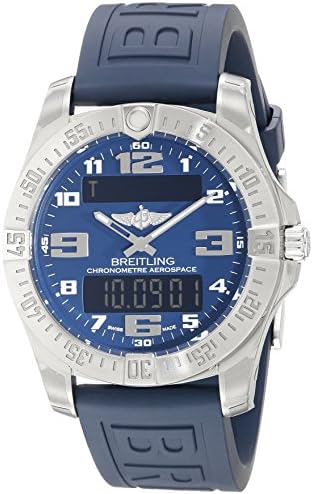 Titanium case with a blue rubber strap. Uni-directional rotating titanium bezel. Blue dial with luminous silver-toned hands and Arabic numeral hour markers. Minute markers around the outer rim. Dial Type: Analog-digital. Luminescent hands and markers. Perpetual calendar. Automatic movement. Scratch resistant sapphire crystal. Solid case back. Case diameter: 43 mm. Case thickness: 10.80 mm. Round case shape. Tang clasp. Water resistant at 100 meters / 330 feet. Functions: 12/24 hour format, alarm, countdown timer, chronograph, hour, minute, second. Luxury watch style. Watch label: Swiss Made. Breitling Aerospace Evo Blue Dial Rubber Mens Watch E7936310-C869BLPT3.