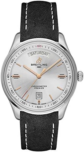 Breitling Premier Automatic Day & Date 40 A45340211G1X4 men's watch. Features a polished stainless steel case and black nubuck leather strap. Polished stainless steel fixed bezel. Silver dial with rose gold accents and luminescent hour hand, minute hand and markers. Index hour markers. Day of the week displayed in dial aperture at 12 o'clock. Date displayed in dial aperture at 6 o'clock. Powered by the Breitling Caliber 45 self-winding automatic COSC Chronometer certified movement which boasts a 38 hour power reserve, beats at 28,800 vph and contains 26 jewels. A cambered, scratch resistant sapphire crystal glareproofed on both sides protects the dial. The case is round, 40mm in diameter and 11.40mm thick. Inlet size: 20mm. Non screw-locked crown with 2 gaskets. Screw down case back. Stainless steel tang buckle. Water resistant 100 meters / 330 feet. Functions: hours, minutes, seconds, day, date. Casual watch style. Swiss made.