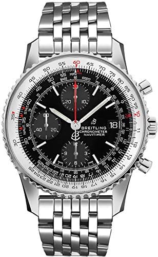 Breitling Navitimer 1 Chronograph 41 A13324121B1A1. Comes with a polished stainless steel case and polished stainless steel Pilot bracelet. The Bidirectional rotating bezel has a circular aviation slide rule. The index hour markers and central hour and minute hands are luminescent. Dial type is analog. Dial color is black. The date is displayed at 3 o'clock. The chronograph features a large red central seconds hand, a 30 minute counter sub-dial at the 12 o'clock position and a 12 hour counter sub-dial at the 6 o'clock position. The small seconds sub-dial is located at 9 o'clock. Powered by the Breitling Caliber 13 self-winding automatic chronometer certified movement which boasts a 42 hour power reserve, beats at 28,800 vph and contains 25 jewels. A cambered scratch resistant sapphire crystal glareproofed on both sides protects the dial. The case is round, 41mm in diameter, weighs 79.40g and is 14.44mm thick. Non screw-locked crown, has 2 gaskets. The case back is screwed in. Inlet width: 22 mm. Stainless steel deployment buckle. Water-Resistant to 30 meters / 100 feet. Functions: hours, minutes, small seconds, date, chronograph, slide rule. Aviation watch style. Swiss Made.