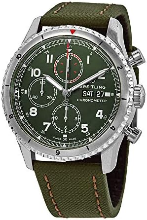 Green dial. Silver-tone stainless steel case with a khaki green fabric band. Automatic movement. 100 meters / 330 feet water resistance. Bi-Directional Rotating bezel. Tang clasp. Case size 43 mm x 14.17 mm. Breitling A133161A1L1X1 Aviator 8 Watch.