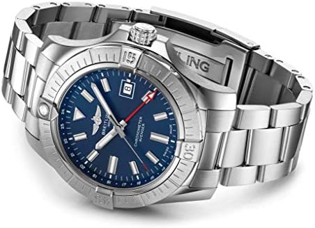 Blue dial enhanced by luminous silver-tone hands. Silver-tone stainless steel case with a silver-tone stainless steel band. Automatic movement. 300 meters / 1000 feet water resistance. Uni-directional Rotating bezel. Scratch Resistant Sapphire crystal. Solid caseback. Deployment with Push Button Release clasp. Screw Locked crown. Case size 45 mm x 12.31 mm. Band 22 mm x long. Breitling A32395101C1A1 Avenger GMT 45 Watch.