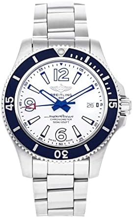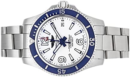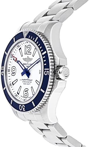 White dial enhanced by luminous blue hands. Silver-tone stainless steel case with a silver-tone stainless steel band. Automatic movement. 500 meters / 1650 feet water resistance. Uni-directional Rotating Coin Edge bezel. Scratch Resistant Sapphire crystal. Solid caseback. Fold Over clasp. Screw Locked crown. Case size 42 mm x 13.30 mm. Band 20/18 mm x long. Breitling A17366D81A1A1 Superocean Watch.