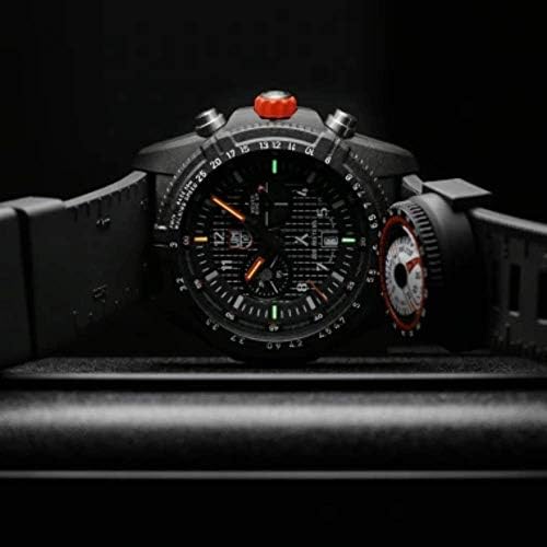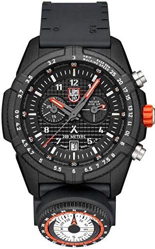 Men's watch in black rubber from Luminox -- The watch has a black Carbonox case with a diameter of 45 mm -- Black dial, luminous hands, indices and red second hand, compass, with date display, stopwatch, pin buckle, Luminox logo -- The watch has a water resistance of 200 metres -- Movement: quartz