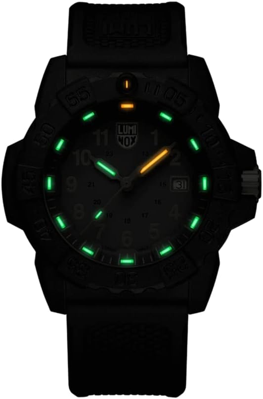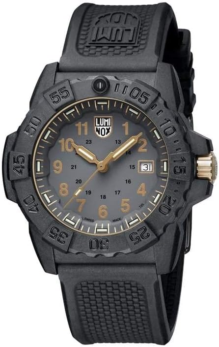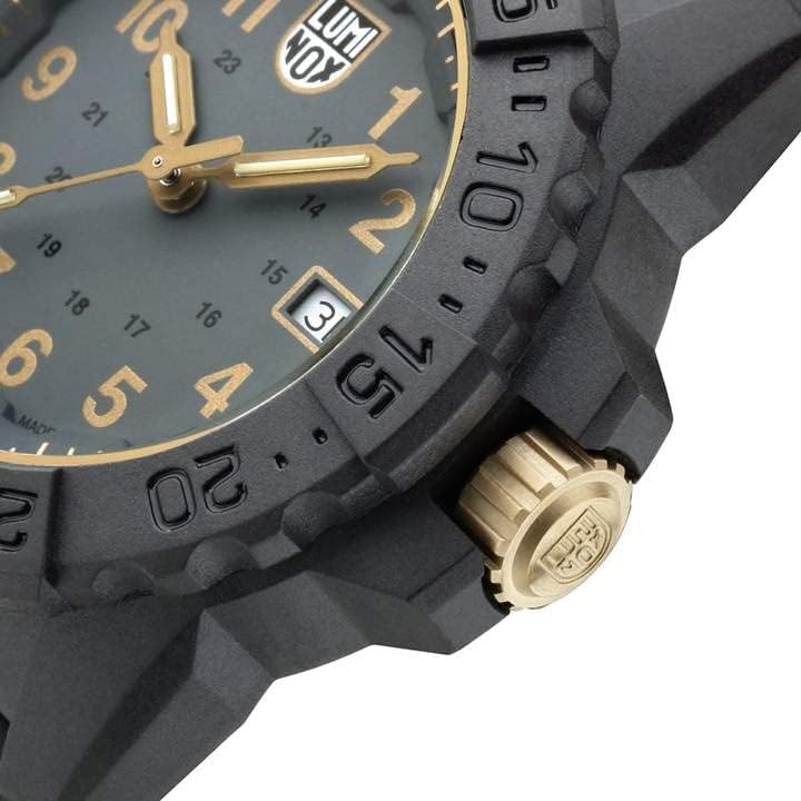 The Navy SEAL 3508.GOLD military watch features a 45 mm CARBONOX case, which is light, tough and incredibly durable, and water resistant to 200 meters. The subtly elegant gold touches are on the hands, the crown, around the Luminox logo, the caseback, and the 12-hour numbers on the dial. Crystal glass material: Hardened mineral crystal (550-650 Vickers) Crown: * in, double security gasket, crown protected.