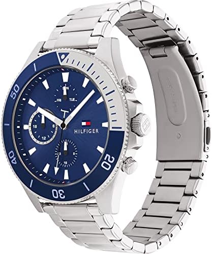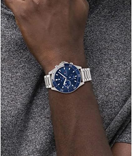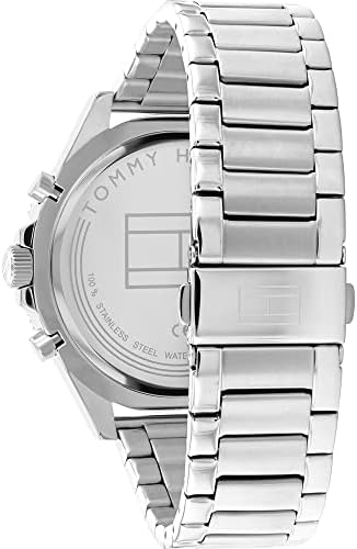 Stainless steel chain-link strap -- Three sub-counters -- Tommy Hilfiger flag on dial