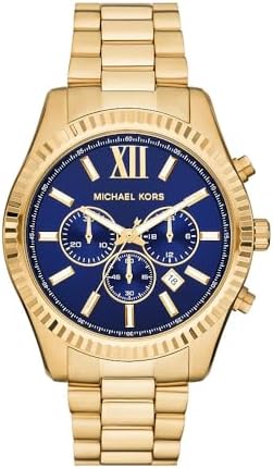 The 44mm Michael Kors Lexington watch has a sunny navy blue dial, chronograph movement and a gold stainless steel bracelet.