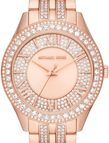 Michael Kors watch for women from the Harlowe collection. Rose gold dial with a diameter of 38 mm in stainless steel and polished finish. The bracelet is made of rose gold stainless steel with a mixed finish, the clasp is fold-over clasp. Water resistant to 5 ATM. Reference is MK4710
