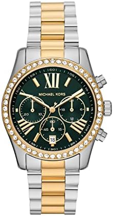 38mm case, mineral glass, quartz movement with analog chronograph display, 20mm band width. Round stainless steel case with green dial. Bicolour, Stainless Steel Band. Water resistant up to 100 m (330 ft): portable for bathing, swimming, snorkeling and diving in shallow water.