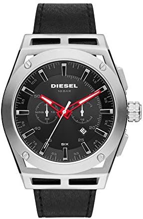 Watch Sizing GuideThe Diesel® Timeframe Chronograph Watch features a round silver-tone stainless steel case, adjustable leather wrist strap, and black dial face. Traditional buckle closure. Three-hand analog display with quartz movement. Chronograph functional. Dial face features stick index hour markers, two sub-dials, date display window, and brand name. Minute track at dial ring Water resistant up to 10 ATM/100 meters. Measurements: Case Height: 41 mm Case Width: 41 mm Case Depth: 14 mm Band Width: 25 mm Band Circumference/Length: 7 in Weight: 4 oz