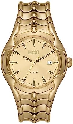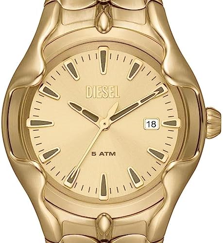 Diesel watch from the Vert collection for men. 3 ball quartz movement, made of stainless steel with a round shape case with a mixed finish in gold colour. The dial is gold in colour. Case diameter: 44 mm. Case Thickness: 11mm Lug spacing: 22 mm. The strap is made of stainless steel, with mixed finish. Band Color: Gold Band Type:Bracelet Closure: fold-over clasp The water resistance is 5 ATM. Reference is: DZ2186
