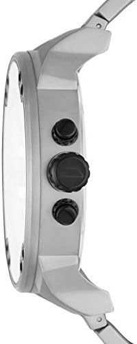 Silver-tone stainless steel case with a silver-tone stainless steel bracelet. Fixed silver-tone stainless steel bezel. Silver-tone dial with black hands and Arabic numeral and index hour markers. Minute markers around the outer rim. Dial Type: Analog. Luminescent hands. Date display at the 3 o'clock position. Chronograph - sub-dials displaying: three - 60 second, 30 minute and 24 hour. Miyota Caliber 2025 quartz movement. Scratch resistant mineral crystal. Pull / push crown. Solid case back. Round case shape, case size: 57, case thickness: 14. Band width: 28 mm. Fold over with safety release clasp. Water resistant at 30 meters / 100 feet. Functions: chronograph, date, hour, minute, second, 24 hour, multi-time zone. Casual watch style. Watch label: Japan Movt. Diesel Mr. Daddy 2.0 Chronograph Quartz Silver Dial Men's Watch DZ7421.