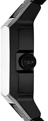 36mm case, 28mm lug width, mineral crystal, Quartz movement with 3-hand analog display, imported. Square stainless steel case, with a black dial. Black, leather band. Water resistant up to 50m: Wearable while swimming in shallow water.