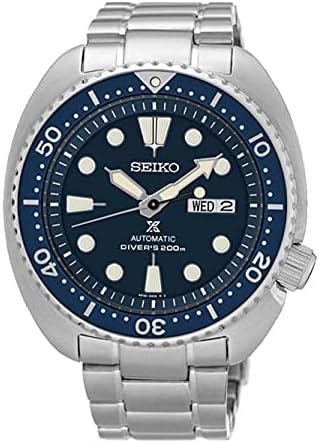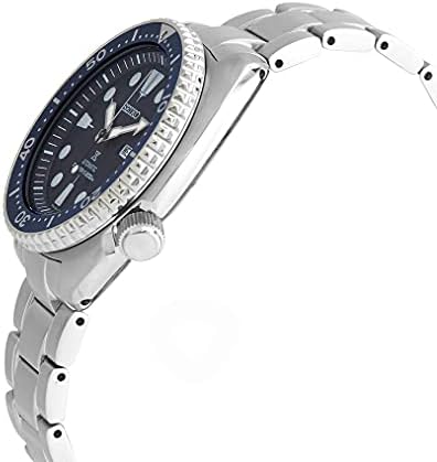 Stainless steel case with a stainless steel bracelet. Uni-directional rotating stainless steel with an inlaid blue ring bezel. Blue dial with luminous silver-tone hands and dot hour markers. Minute markers around the outer rim. Dial Type: Analog. Luminescent hands and markers. Day of the week and date display at the 3 o'clock position. Caliber 4R35 automatic movement. Scratch resistant Hardlex crystal. Solid case back. Round case shape. Case size: 44 mm. Case thickness: 12 mm. Band width: 22 mm. Fold over clasp. Water resistant at 200 meters / 660 feet. Functions: date, hour, minute, second. Prospex Series. Casual watch style. Seiko Prospex Automatic Blue Dial Stainless Steel Men's Watch SRPE89K1.