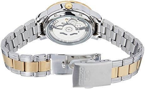 This Seiko 5 Automatic White Dial Two Tone Silver Gold Stainless Steel Ladies Watch SNK892K1 makes for a superb addition to your wrist. A white dial is complimented by gold indexes and hands, of which are powered by an automatic 21 jewel movement. Furthermore, the ever present Seiko 5 logo can be seen just underneath the 12 o'clock index. Moreover, a day and date window can be seen at the 3 o'clock position. Then, a two tone silver and gold stainless steel case sits neatly around the dial alongside hardlex crystal glass to provide it with protection and class. On the flipside is a see through caseback which shows you the inner workings of the timepiece. Finally, a two tone silver and gold stainless steel bracelet can be fastened using a fold over clasp. This watch has a water resistance of 50 metres, making it suitable for surface swimming.