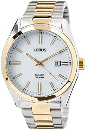 Lorus RX336AX9 Men's Solar Watch Gold Plated with Metal Strap. Bi-colour casing: a gold plating on the bezel provides a special contrast to the rest of the case, which is made of robust, silver-shiny stainless steel. Metal strap: the high-quality metal bracelet with its flat folding clasp with safety push button ensures maximum comfort on the wrist. Waterproof wristwatch: the watch is waterproof up to 10 bar, i.e. at a depth of up to 100 metres. It can therefore easily withstand accidental water splashes when washing hands, rain or sweat. Light coating: the Luminous luminous coating ensures that the time is readable even in the dark. Diameter 32.0 x 8.0 mm