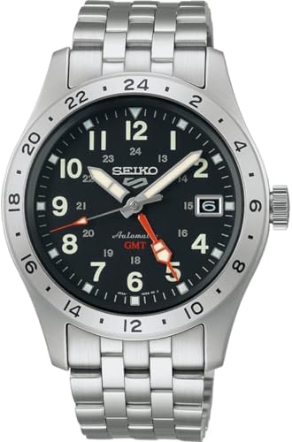 The Seiko 5 Sports Field collection was created with an ‘in the field’ military design –taking inspiration from a style originally called a ‘trench watch,’ created to be robust and reliable in tough conditions –echoing the Seiko 5 Sports characteristics. This Seiko 5 Sports ‘Deception’ field watch with its black dial and bezel takes the design to the next level, with a GMT function that allows you to track a second time zone. The black-coloured bezel features a 24-hour indication and a large, orange GMT hand for legibility. The base design and size remains the same as the original field watches, ensuring that the design style remains timeless whilst the calibre evolves. Whilst being a robust sports watch, this piece has a black calf leather strap. Seiko 5 Sports is known for over fifty years of reliability, durability, performance and value. ‘’5’’ represents the original five key features of every Seiko 5 still present today: Automatic movement, Day-date display, Water Resistance, Recessed crown and Durable case and strap. Seiko offers an exceptional range of watches for men. All with the most up-to-date designs and long-lasting durability, whether they are in the fashion, sport or technical ranges.