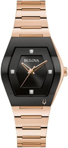 Add modern elegance to your every day with the newest addition to Bulova’s Modern collection for women, the diamond-accented Gemini. This watch has a contemporary sophistication with its curved tonneau design and rose gold-tone stainless steel metalized black case and black 3-hand dial, accented by 4 radiant, hand-set diamonds at the 15-minute markers, and is finished with Bulova’s signature edge-to-edge curved crystal. The rose gold-tone stainless steel bracelet fastens with a deployant clasp and pushers. This sleek timepiece will enhance any ensemble and contribute to the wearer’s sense of style and allure.