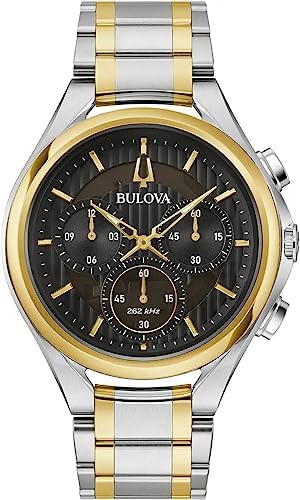 This new Bulova men’s five-hand chronograph timepiece pushes the ground-breaking CURV collection in a new direction that affords unrivalled sophistication together with Bulova’s cutting-edge technology. CURV timepieces are equipped with the world’s first curved chronograph movement, with high-precision 262khz quartz technology offering exceptional accuracy of 5 seconds per month. This new CURV model features a dynamic two-tone stainless steel case with brushed and polished finishes and a curved sapphire crystal. The refined black dial features striped patterning, with a translucent ring offer a glimpse at the intricate movement beneath. Gold-tone markers and hands offer contrast against the dial, while three sub-dials display the elapsed chronograph time in 12-hour, 60-minute, and 60-second intervals. The chronograph 60-second sub dial at 6 o’clock doubles as the standard seconds hand. The dual mode is implemented by the 4 o’clock pusher. The watch is paired with a matching tapering two-tone stainless steel b