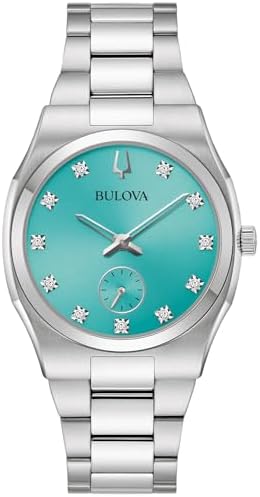Modern women's wristwatch from the "Bulova Classic" collection, precise quartz movement, turquoise sunray dial, skeleton hands, diamond indexes, small second display, matte stainless steel case, polished bezel and edges, ribbed crown with logo, scratch-resistant mineral glass, polished stainless steel strap with matte details, butterfly clasp with button and logo, water resistant to 3 bar, width (without crown) 344 mm, height: 10 mm. in. in. mm