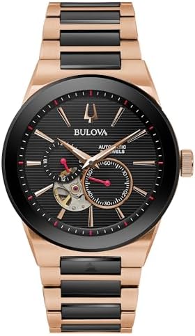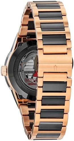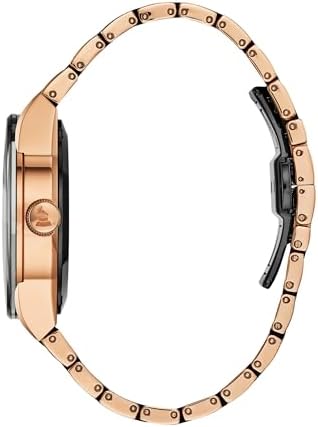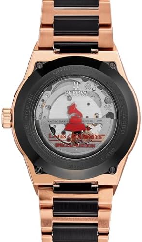 As the official Timepiece partner of The Latin GRAMMY, Bulova has created the Latin GRAMMY Automatic watch, incorporating musical cues in its design. The distinct timepiece features an open heartbeat aperture and an exhibition case back, showcasing the fine 21-jewel Automatic movement with a 42-hour power reserve. Rose gold-tone stainless steel case with a black dial that is textured to resemble the guiro instrument with guiro scraper-shaped markers. Signature Latin GRAMMY red accents on the dial. Rose gold-tone bracelet with black link details reminiscent of piano keys. Metalized Domed Sapphire Crystal 30M Water Resistant