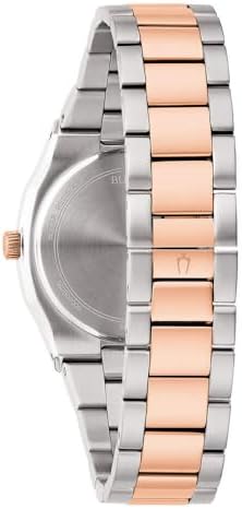 Bulova Surveyor mother-of-pearl time-only women's watch with diamonds 98P221. Watch with steel case with a diameter of 34 mm and a thickness of 9.7 mm. Rose gold-tone polished and satin finish stainless steel bezel. White mother-of-pearl dial with mineral glass and white diamonds. Time-only quartz movement. Two-tone, silver and rosé steel bracelet. Deployment Clasp. 30 meter water resistance. .