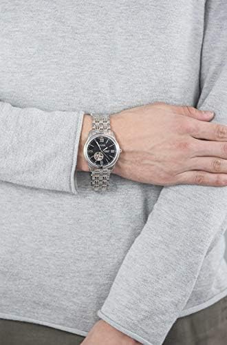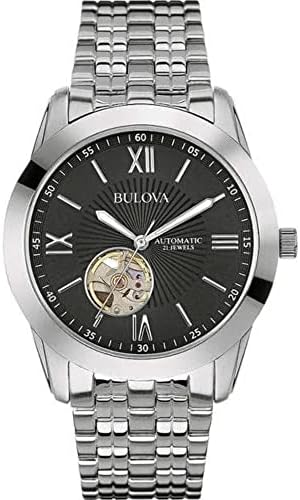 Bulova analogue mechanical men's watch steel 96A158 Bva Series. Watch with 42 mm steel case, black dial with mineral glass, sphere showing mechanical movement, stick indexes with Roman numerals. Steel bracelet, closure with buttons. Clock with mechanical movement, water resistance of 3 atm. .