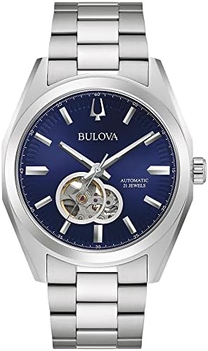 Part of the Surveyor line of Bulova watches, this updated classic automatic watch offers all of the detail and quality you would expect in a luxury watch, while staying at an affordable price point. The stainless steel case and bracelet are paired with a blue three-hand dial with silver-tone accents and an open aperture to view the movements balance wheel and escapement. The screw-back case is topped with a mineral crystal exhibition window to showcase the automatic movement powering the timepiece. This beautifully detailed, quality timepiece is destined to become a new favourite in any collection.