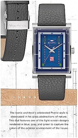 Recognized as a cornerstone of American architecture, the Frederick C. Robie House, built in 1906 in Chicago, Illinois, is one of Frank Lloyd Wright’s most famous works where he boldly established the Prairie style that blended the boundaries between interior and exterior spaces. His distinctive art glass windows featured throughout in geometric diamond and chevron abstractions of American prairie flora are the inspiration behind the design of our exclusive timepiece. Made with a rectangular case to reflect the strong horizontal lines of the Robie House, it features a silver-tone stainless steel case with applied indexes and a four-layer constructed dial that is finished with a curved, metalized mineral crystal that showcases the blue, gray, and green colored dial, a 3-hand movement with a signature second hand, and a case back that includes the date the Robie House project was completed. This collector’s watch also features a gray textured leather strap with the window design embossed on the inner strap, a deployant buckle closure with Frank Lloyd Wright’s signature, and water resistance to 30 meters.