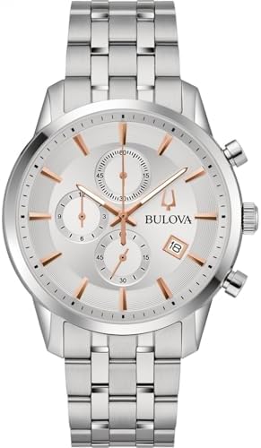 Bulova Sutton Chrono gray men's watch 96B411 316L steel. Watch with steel case with a diameter of 41 mm and a thickness of 9.70 mm. Stainless steel bezel with polished and satin silver finish. Gray dial with mineral glass and date display. Pink indexes and hands. Quartz chronograph movement. Silver-tone steel bracelet. Standard closure with buttons. Waterproof up to 10 bar. .