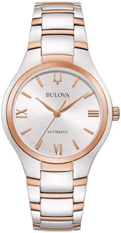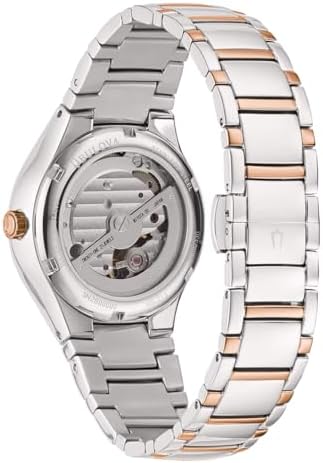 Bulova Lady two-tone automatic women's watch 98L313, steel case and bracelet. Watch with steel case with a diameter of 34 mm and a thickness of 11 mm. Rose gold-tone polished and satin finish stainless steel bezel. Silver-colored dial with mineral glass and pink indexes. Caseback with transparent porthole and visible movement. Automatic movement with 40 hour power reserve. Two-tone silver and rosé steel bracelet, standard closure with buttons. 3 ATM water resistance.