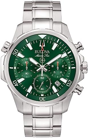 Bulova Marine Star green steel chronograph men's watch 96B396. Watch with steel case with a diameter of 43 mm and a thickness of 12 mm. Ring in stainless steel with polished and satin silver finish. Green analogue dial with mineral glass, chrono counters and date. Screw-down case back and crown. Chronograph quartz movement. Silver-colored steel bracelet, standard push-button closure. 10 Bar water resistance. .