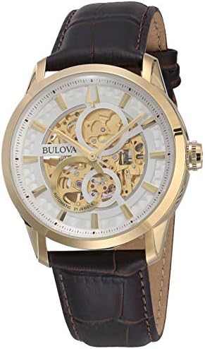 Watch Sizing Guide A classic that holds weight all on its own. Stainless steel case. Croc-textured leather bracelet with deployment buckle closure. Round face. Three-hand analog display with automatic movement. Open dial features gold-tone hands and hour markers, minute track, and Bulova detailing. Water-resistant up to 165 feet. Display case included. Imported. Measurements: Case Height: 41 3⁄5 mm Case Width: 41 3⁄5 mm Case Depth: 12 1⁄10 mm Band Width: 21 7⁄10 mm Band Circumference/Length: 9 3⁄4 in Weight: 3 oz