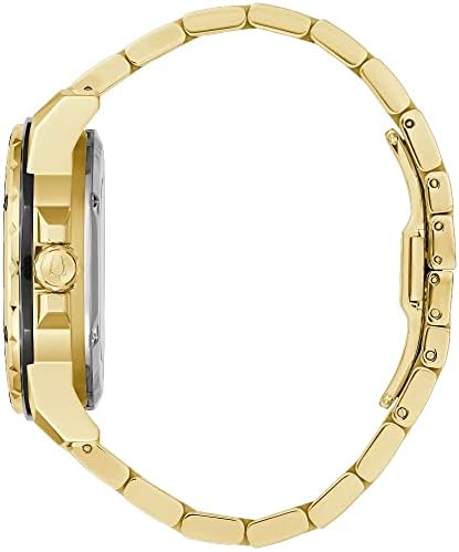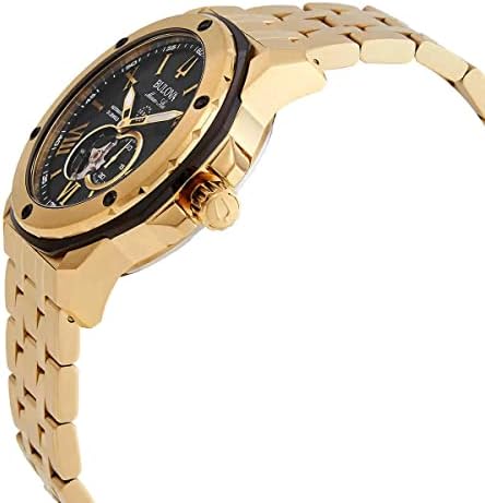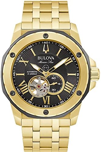 The Bulova Marine Star men’s watch is a classic timepiece with a legacy stretching back decades. The open heartbeat automatic 21-jewel movement is showcased in the dial aperture and in the exhibition case back. The gold-tone, stainless steel case is accented with black, and features a black dial and a flat mineral crystal. The gold-tone stainless steel bracelet is perfectly matched for a seamless look and the watch is water resistant to 200 meters, living up to its name as a timepiece that can go wherever you do without missing a beat.