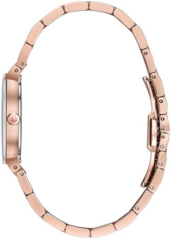 From the modern collection. An elegant choice, this ladies' timepiece is featured in rose gold-tone stainless steel with 11 diamonds individually hand set on the rose gold-tone mother-of-pearl dial. Additional features include metalized edge-to-edge domed mineral crystal, a screw-back case, rose gold-tone stainless bracelet with double-press deployment closure.