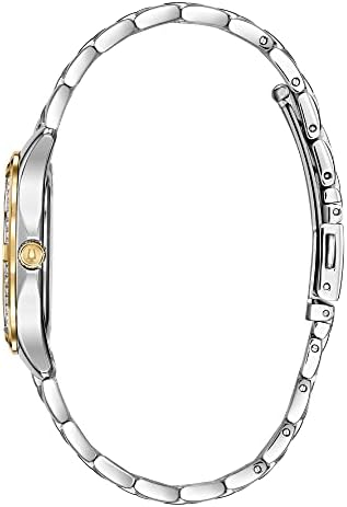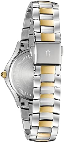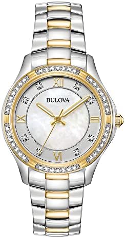 From The Bulova Crystal Collection. This Ladies' Timepiece Is A Slim Sculpted Two Tone Stainless Steel Watch Illuminated By 50 Crystals On The Bezel And Three-Hand White Mother-Of-Pearl Dial. Additional Features Include Flat Mineral Crystal, Two Tone Stainless Steel Bracelet With Short Fold-Over Pusher Closure, Quartz Movement And Water Resistance To 30 Metres.