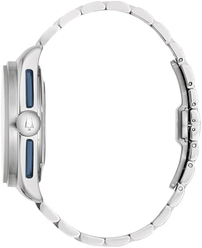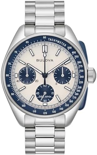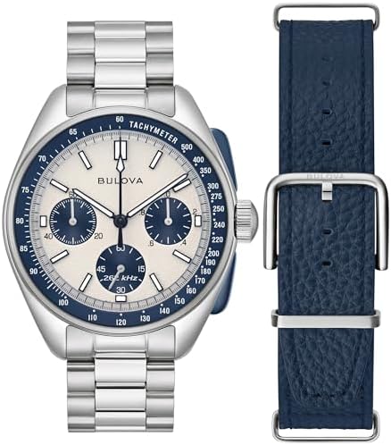 On August 2, 1971, a Bulova chronograph was worn on the moon, engineered for the demands of the lunar environment. Now, Bulova returns to the design and updates it with an exclusive high precision quartz movement, continuing its legacy of precision timing with the men’s Bulova Lunar Pilot chronograph from the Archive Series. The Lunar Pilot chronograph features the same 43.5mm silver-tone stainless steel case as the original Bulova chronograph. Slim, blue chronograph pushers and a crown featuring the Bulova tuning fork logo are positioned at 3 o’clock. Under the flat sapphire crystal, the six-hand chronograph dial is rendered in a blue-and-silver panda design, with a blue tachymeter ring and retro Bulova name. The slim hands and applied markers offer exceptional legibility and are applied with super luminova for low-light display. The recessed, circular grooved sub-dials include a 1/20 chronograph seconds counter at 3 o’clock, running seconds p hand at 6 o’clock, and 60-minute chronograph counter at 9 o’clock