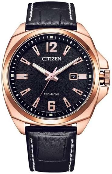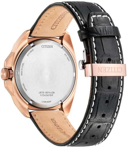 Make a sophisticated style statement with this Men's Sport. Featuring a striking combination of black and rose gold-tone, this watch is sure to make an impression. The rose gold-tone stainless steel case showcases a black 3-hand dial with date and rose gold-tone accents and is finished with sapphire crystal. The rich black leather strap with deployment clasp for easy accessibility. With water-resistant up to 100 metres and Citizen’s sustainable Eco-Drive technology that powers the watch by any light, this uniquely elegant dress watch will rise to many occasions.