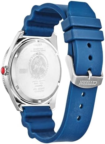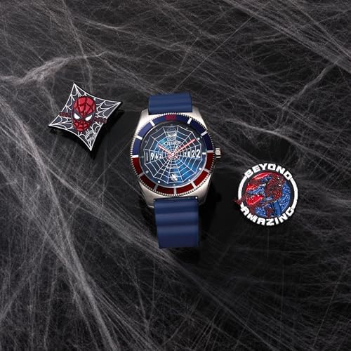 Are your Spidey-Senses tingling. Meet the latest addition to the Citizen’s popular MARVEL inspired watch collection, the Spider-Man 60th Anniversary Limited Edition box set. This watch is limited to 1962 pieces, in honour of the year Spider-Man first spun his web. The blue 3-hand dial features Spider-Man with luminous eyes surrounded by a web-like printed dial to create a dimensional effect. The anniversary dates 1962-2022 are also luminously displayed on the dial, and the 60-minute mark is highlighted to celebrate the 60th anniversary. The silver-tone stainless steel case is contrasted by a blue polyurethane strap with a buckle closure. The case back further celebrates the hero their with an etching of Spider-Man in his classic pose; encircling him is the phrase “Beyond Amazing”. This exceptional watch has Eco-Drive technology and never needs a battery. Completing the set are two Spider-Man pins. Spin your own web with this Beyond Amazing commemorative timepiece set.