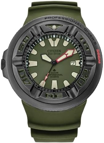 Explore the deepest depths with the Promaster Diver ‘Ecozilla’ with water resistance up to 300 metres. This bold high-performance ISO-compliant dive watch is reimagined from a fan favourite and features striking details that will stand out on your wrist. Featuring a black ion-plated stainless-steel case, a green 3-hand dial with luminous hands and markers for superior legibility, and a durable, green polyurethane strap for lightweight comfort. Featuring a one-way rotating elapsed time bezel, screw-back case and crown and completed with an engraving of a diving helmet on the case back. Sustainably powered by light with Eco-Drive technology and never needs a battery, this ultimate dive watch comes in a scuba tank-inspired box for the serious diver and collector.