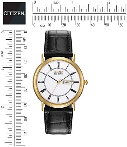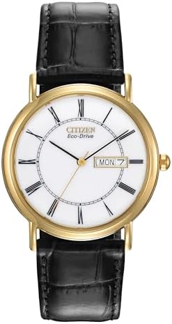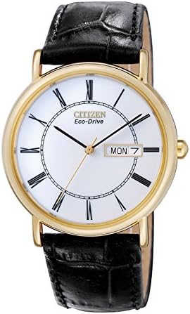 A classic timepiece from Citizen, with a white dial, roman numerals, Gold Tone case and a black leather strap. Date display at 3 o'clock. Featuring Eco-Drive technology – powered by light, any light. Never needs a battery. Citizen eco-drive is fueled by light, any light, it is a watch that never needs a battery Gold-tone watch in stainless steel featuring black two-step dial with date window at 3 o'clock and croco-embossed leather band Japanese quartz movement with analog display Protective mineral crystal dial window Protective mineral crystal dial window and water resistant-splash resistant